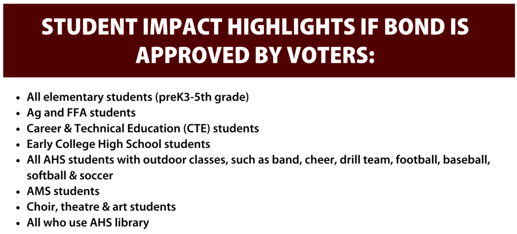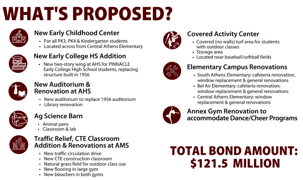 The Athens ISD Board of Trustees has called for a $121.5 million bond election on May 3, 2025, following a unanimous vote during a special meeting on February 13. The bond, if approved by voters, would fund improvements across all campuses and grade levels — enhancing spaces for fine arts, agriculture, early college programs and the district’s youngest learners. The bond election does not come attached to an increase in the AISD property tax rate.
